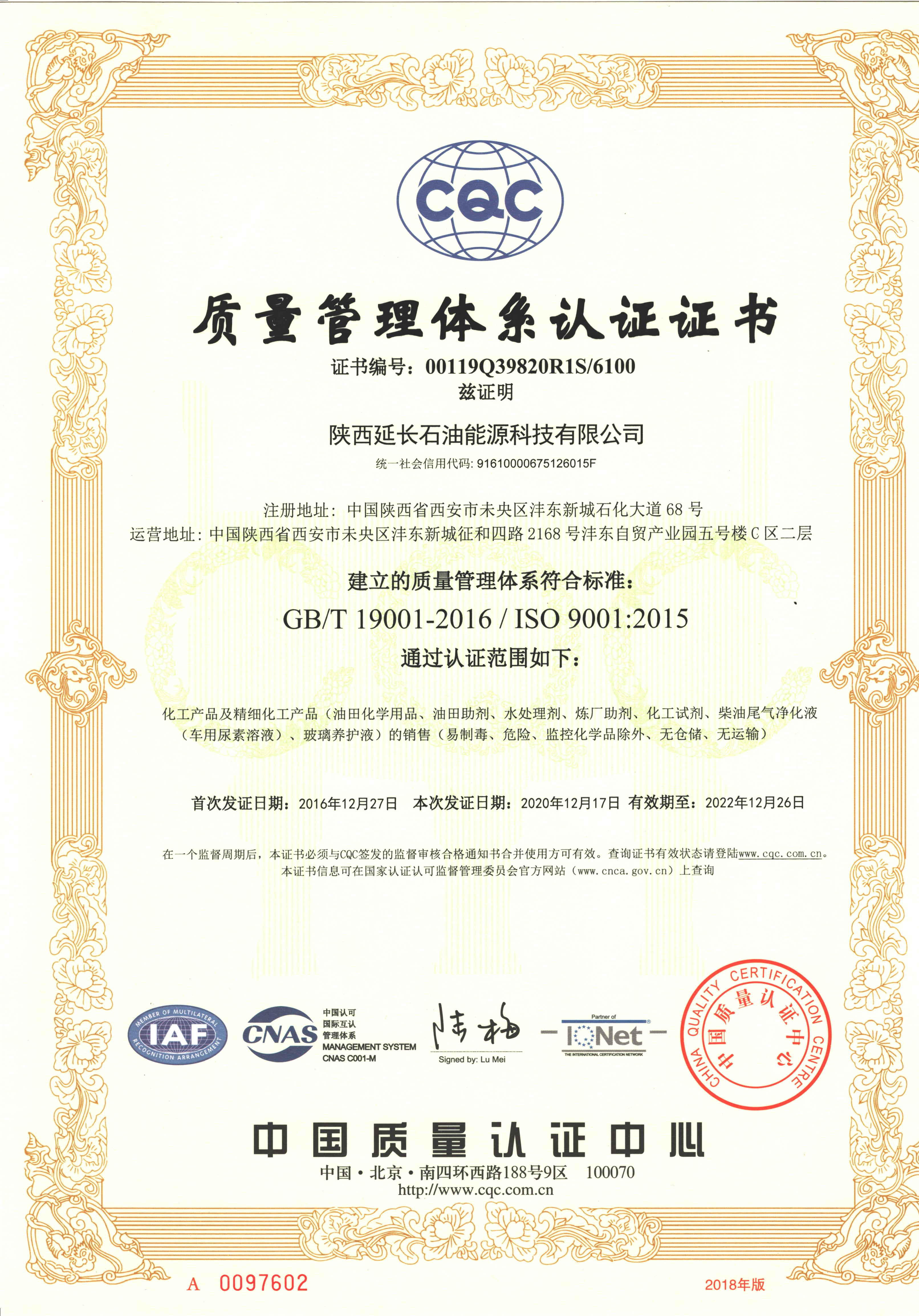 质量管理体系认证证书
